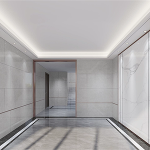 地面用灰色地砖,墙面乳胶漆,吊顶二级吊顶,打造简单,品质的公用空间